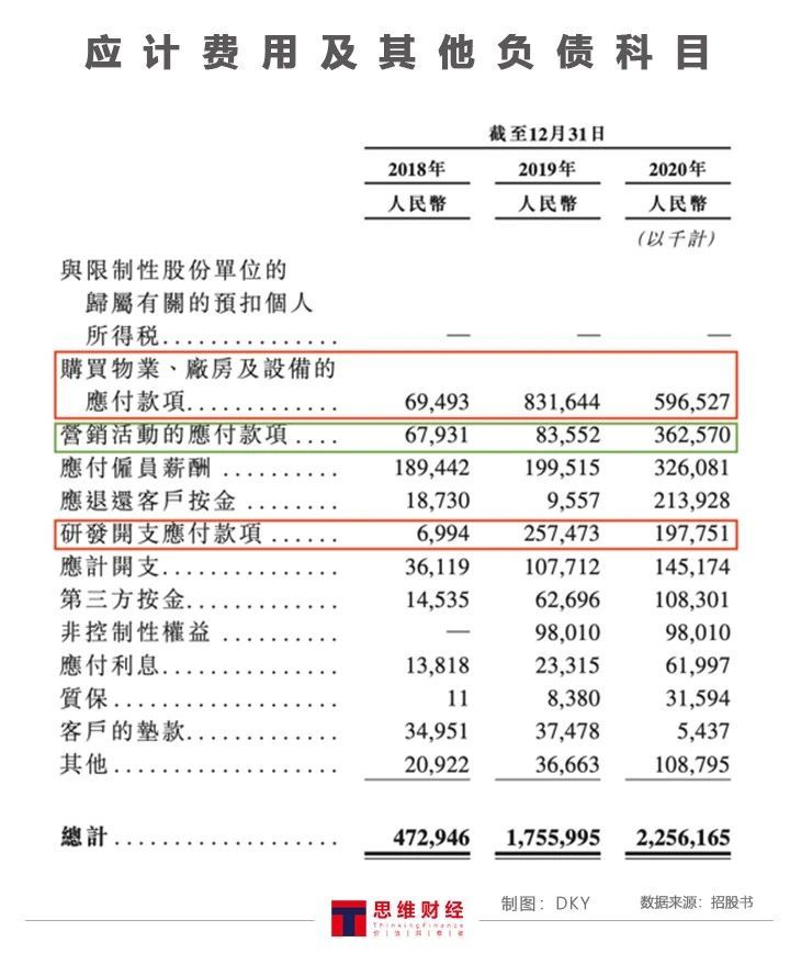 但在应计费用及其他负债的科目中发现,购买物业、厂房及设备的应付款项以及研发开支应付款项出现了一定程度的下降,反而是营销活动的应付款项增长了334%。公司更多的经营开支用于销售、一般及行政开支,此项支出在2020年达到了29.21亿元,占营业收入的49.98%,对比于研发费用占营业收入的19.53%。