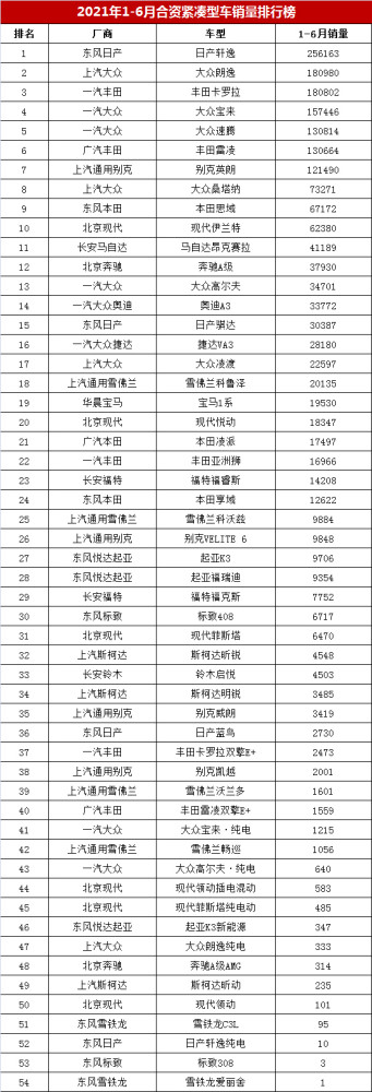 【2021年1-6月轿车销量排行榜 上半年合资紧凑型车销量排名】今年上半年合资紧凑型轿车市场销售不理想,据购车网编辑整理统计显示,2021年1-6月合资紧凑型车累计批发销量为180.1万辆,与受疫情影响的去年同期相比仅小幅增长3.0%,远低于乘用车市场28%的增长幅度。下面,我们一起去看看今年上半年54款合资A级车批发销量及其排名情况: