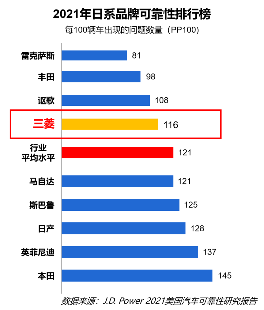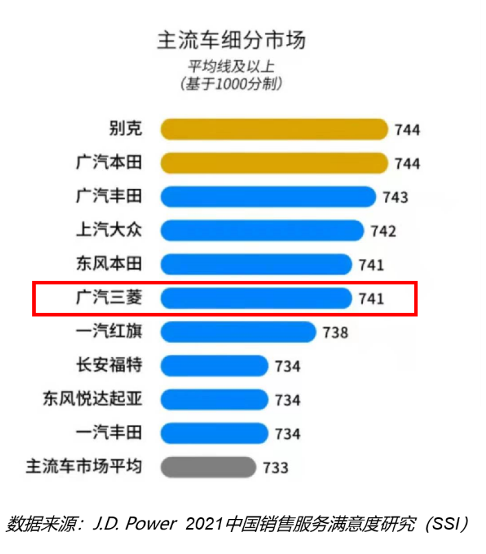 前不久,J.D. Power连续第22年发布了中国销售服务满意度研究(SSI),重点评测了拥车期为2至6个月的新车车主对购车体验的整体满意度:广汽三菱以741分的高分超出主流车市场平均水平,登上排行榜中日系品牌第三的宝座。无独有偶,在J.D.Power发布的2021年美国汽车可靠性研究中,三菱汽车也获得了日系品牌第四的好成绩。