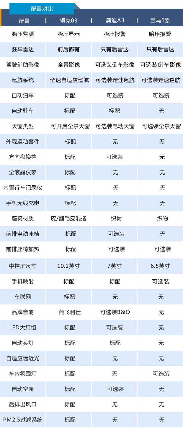 通过对比可以看出,即使售价低了5万元左右,但领克03在配置方面相比另外两款车型占有巨大优势,大部分领克03标配的配置,另外两款车型都需要选装或者根本就没有。