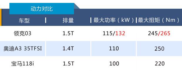 发动机方面,从参数来看,领克03的同样优势明显,即使是1.5T低功率版发动机,其最大功率也优于奥迪A3 35TFSI和宝马118i。