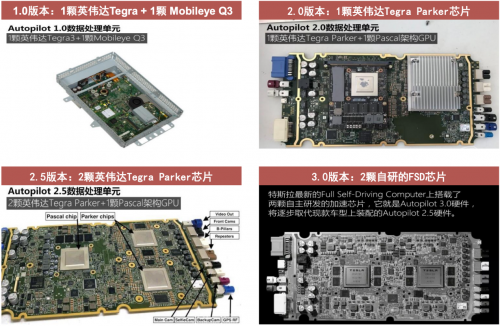 算上此前版本,特斯拉芯片已经经过3次迭代,目前最新的FSD上搭载了特斯拉自主研发的两枚芯片,也就是Autopilot3.0硬件,性能比2.5版本芯片强大21倍。