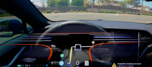 在一段FSD测试视频中,特斯拉会暂时移除仪表两侧的应用,可视化界面将扩大以显示周边额外的信息,而驾驶速度、自动驾驶可用性、自动驾驶速度设置等信息被移到了仪表板的底部,这与当前只显示三条车道的版本融入了更多视觉识别运算。