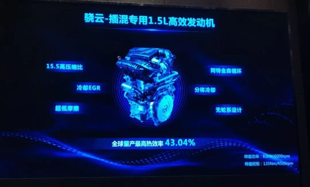 骁云发动机:是首款专为插电混动车型打造的发动机,采用阿特金森燃烧循环,发动机压缩比高达15.5,燃烧热效率更是达到43.03%。官方介绍,这是目前量产发动机中,效率最高的。