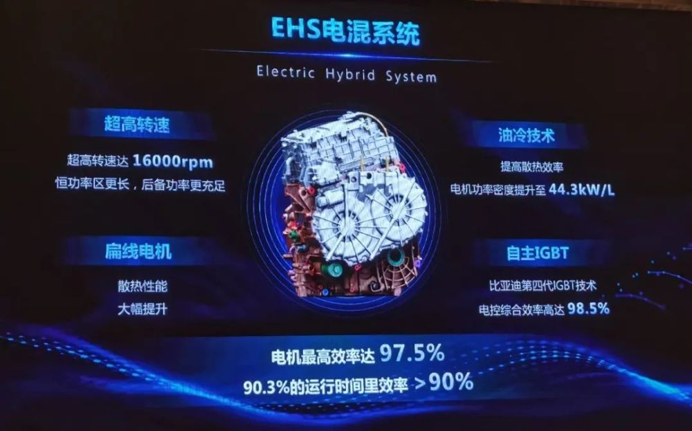 EHS电混系统:负责调节不同工况下发动机和电动机的动力输出比例,低速多用电,高速多用油,充分利用电驱与油驱的高效能区间。电混系统中的电机功率密度44.3kW/L,电机最高效率97.5%,90.3%的运行时间里效率都超过90%。