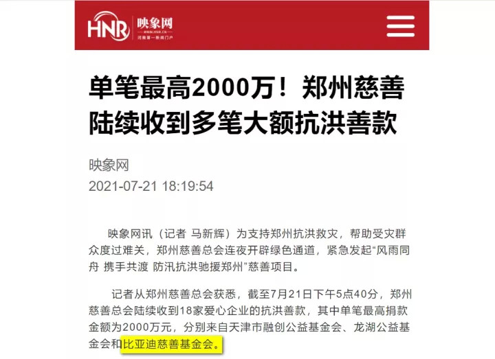 今年河南遭遇强降雨自然灾害,比亚迪慈善基金会第一时间捐款2000万元,用于救灾紧急举措和灾后恢复工作。同时,比亚迪汽车开启车主紧急救援服务通道,并开放郑州市所有4S店作为应急避难场所,为附近市民就近进店提供援助。此外,比亚迪车友自发组成应急供电救援车队,利用比亚迪新能源车可以化身“移动充电宝”的技术优势,前往停电小区,免费提供基础充电服务,帮助灾区群众缓解燃眉之急,恢复基本通讯需要,与灾区群众携手共渡难关。