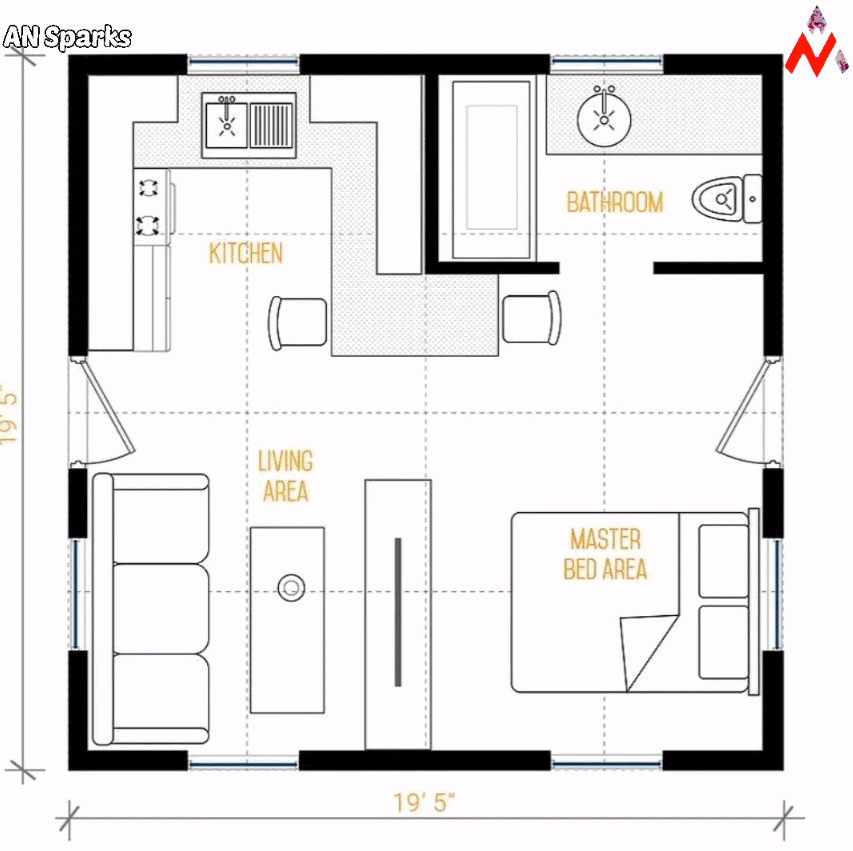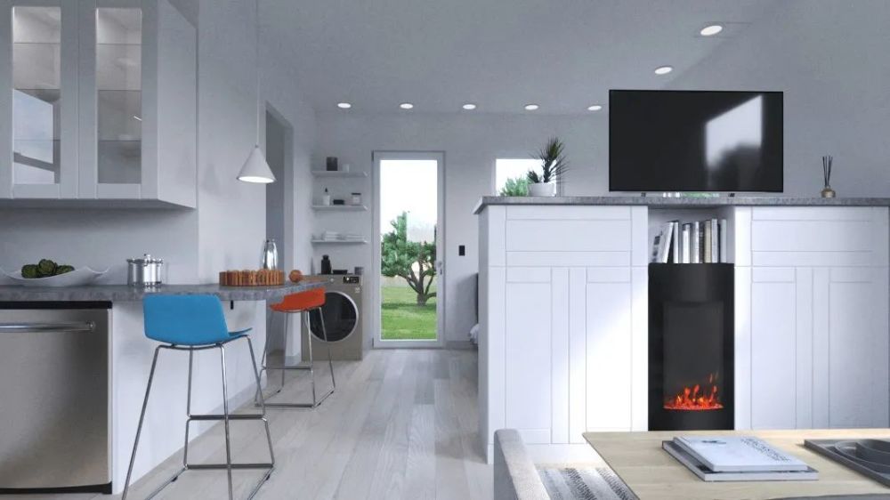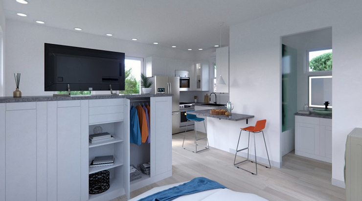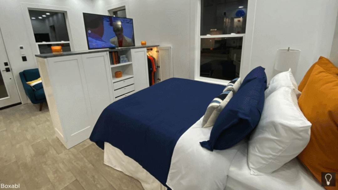实际面积约32.8㎡的Boxabl casita内部具有厨房、浴室、客厅以及一间卧室,4个区域近似“田字形”分设方正空间的四角。