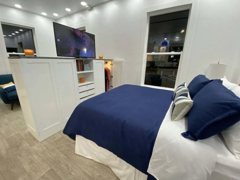 整个空间处处体现极致的布局与强大的收纳,客厅与卧室间的置物柜还做了二者之间的隔断,柜体顶部放置电视,中部屏幕闪烁着有幽蓝色的火苗,极具科技感。