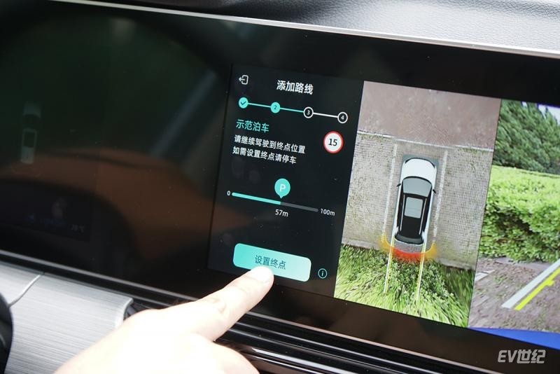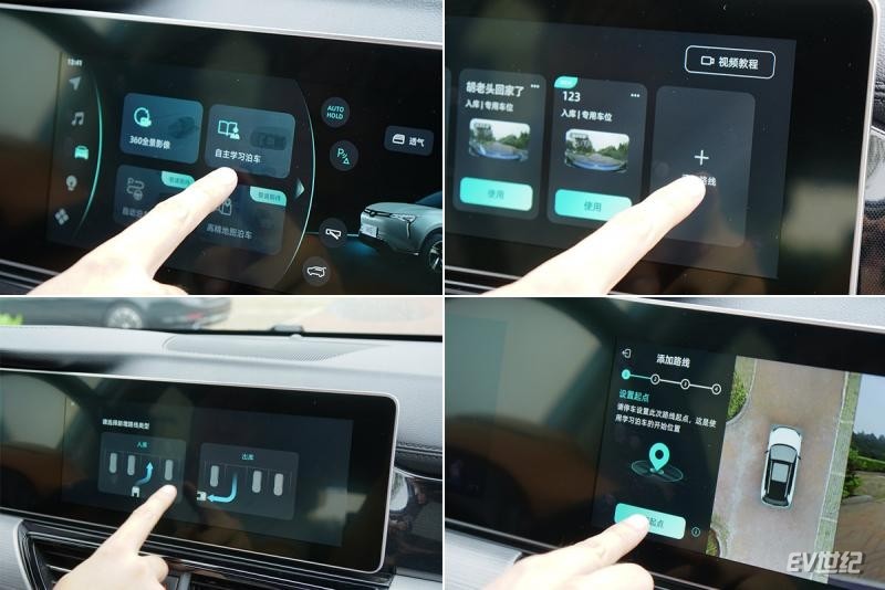 在本次体验中我们也对这一功能进行了实际体验,首先车辆学习过程简单,我们在自己喜欢的位置停好车以后,点击中控大屏上的自主学习泊车功能、之后点击跳转页面后的添加路线,选择入库或者出库一步一步进行就可以了,如果您选择的是入库就是让车辆自主泊车,如果选择了出库就是召唤车辆。