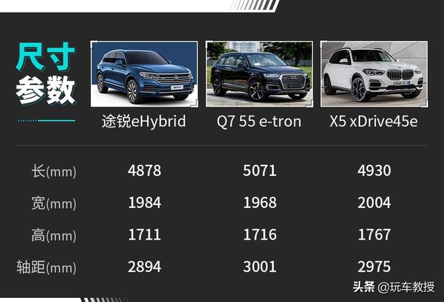 车身尺寸方面,跟燃油版相比高了2.5厘米,如果跟一些同样是高端插电混动车型相比,途锐eHybrid的身材并没有什么优势,尺寸甚至跟一些中型SUV差不多。