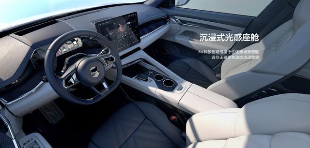 它的内饰部分也非常的干净整洁,一个标准的T字形空间布局、一块15.4英寸独立的液晶中控大屏、一块8.8英寸充满科技元素的液晶仪表、一个独特的换挡杆、两个水杯置放处、琴键式的空调按钮、沉浸式光感座舱等等,总得来说,整体内饰的科技氛围感极强。