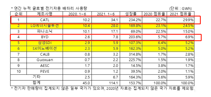 而在今年前6个月中,中国电池巨头宁德时代(CATL)以29.9%的市占率,豪取全球动力电池厂商排名第一,比亚迪以6.9%的市占率排名第四。