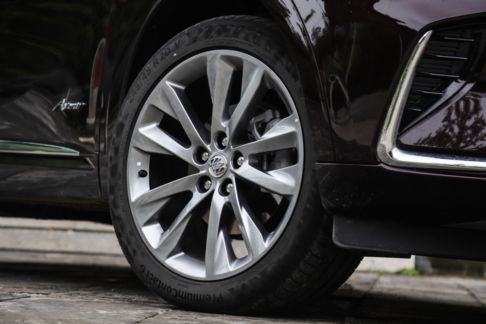 20英寸旋翼式镀铬轮圈是Avenir车型不可或缺的一部分,尺寸大小刚刚好。轮胎方面,与之匹配的是马牌PrimiumContact6系列轮胎,规格为245/45 R20。