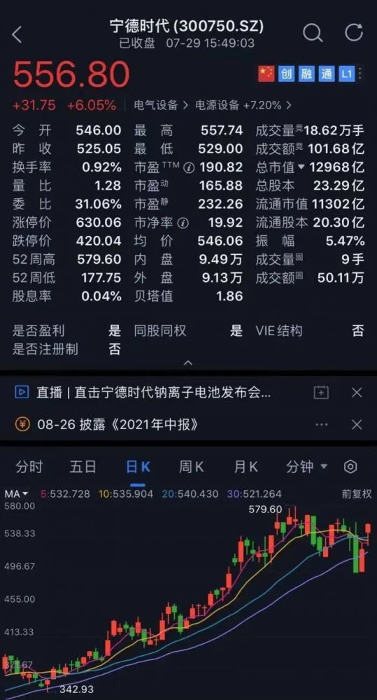 钠离子电池亮相,资本市场闻风而动。7月29日,宁德时代股价涨至556.8元/股,收盘时涨幅达6.05%,总市值达1.3万亿元。同时,华阳股份、荣百科技、圣阳股份、欣旺达等钠离子电池概念股也同步走高。