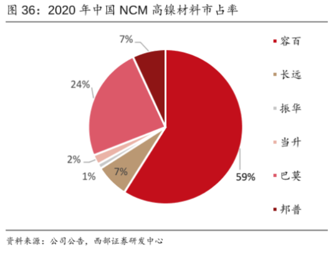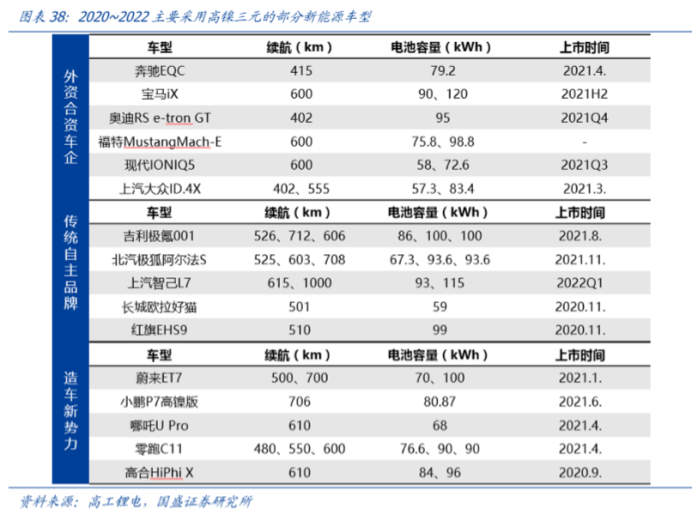 在4月19日开幕的上海车展上,在近80余款新能源车型中,其中43款车型已经搭载或将要搭载高镍电池。潜在爆款新车包括大众ID4、宝马IX3、极氪001、智己L7、北汽阿尔法S等,都将搭载高镍电池。电池厂商也将高镍三元作为下一步发展方向,动力电池龙头宁德时代5月份也表示一季度811的占比达到了2成。