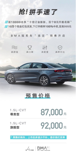 7月30日,吉利汽车旗下的中国品牌轿车领军者第4代帝豪正式启动预售,新车共推出两个版型,1.5L-CVT 尊贵型预售指导价为 8.7万元(享受十倍订金膨胀后预售价为8.2万元),1.5L-CVT 旗舰型预售指导价为9.2万元(享受十倍订金膨胀后预售价为8.7万元)。
