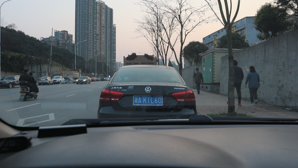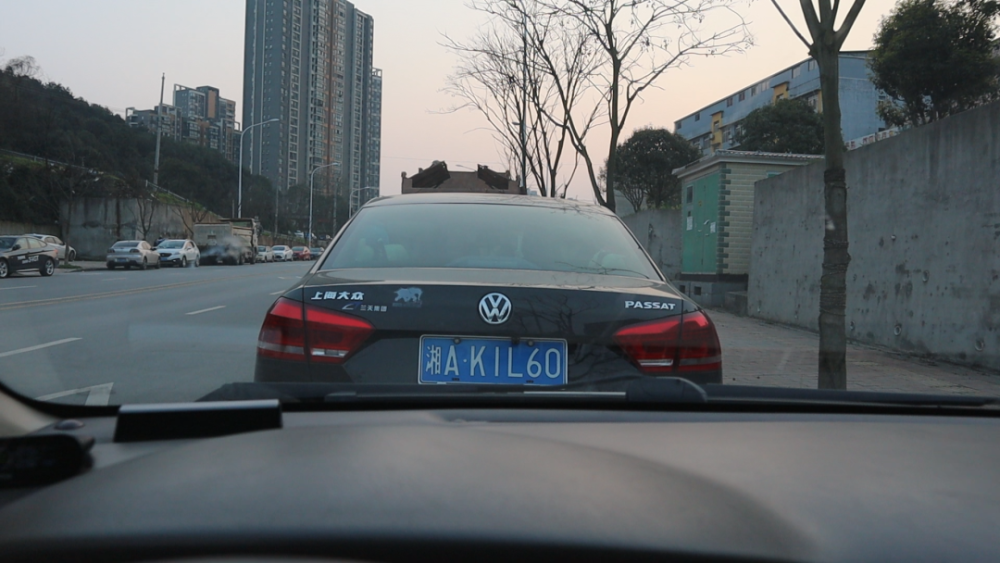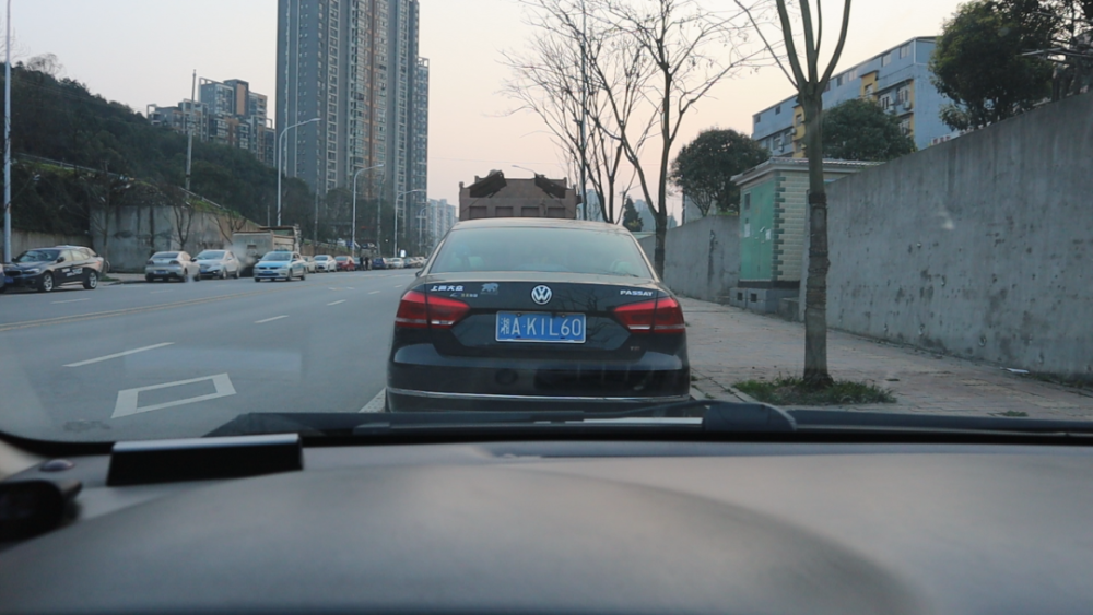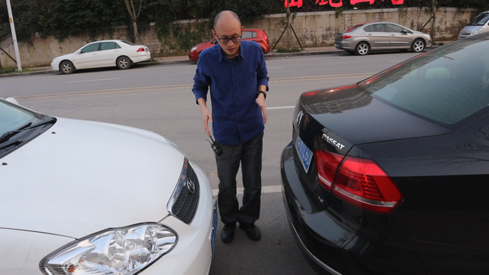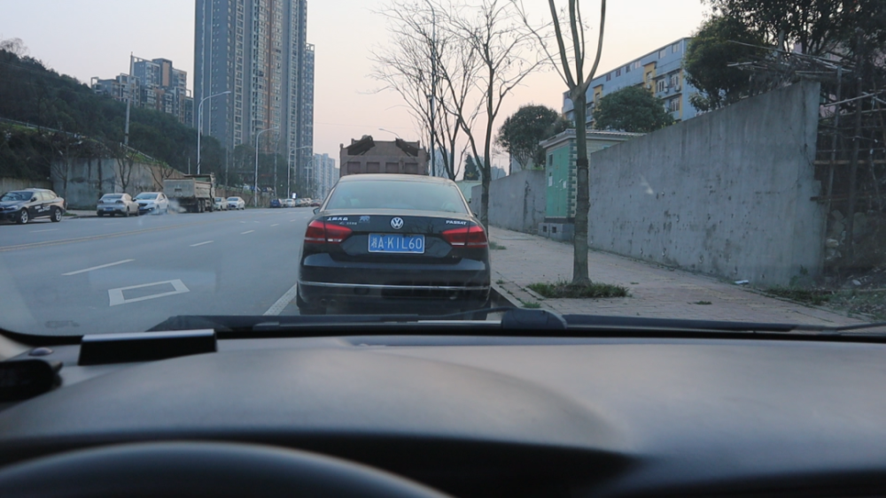 我们这时候的位置离前方的车子,大概就是两米五左右。我们还可以往前开,我们观察挡风玻璃的下沿的位置,当挡风玻璃的位置,接近我们前方车子的车牌下方,这时候这个位置就很近了,这时候我们的车子,跟前方的车子距离大概就是六十多公分的样子,刚好是可以过一个人的距离。