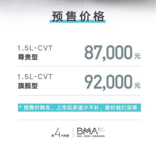 售价方面,吉利第四代帝豪1.5L-CVT尊贵型预售指导价为8.7万元,1.5L-CVT旗舰型预售指导价为9.2万元。同时,此次预售采劝多退少不补”策略,如果汽车上市后价格高于预售价,那么车主无需补贴差价。