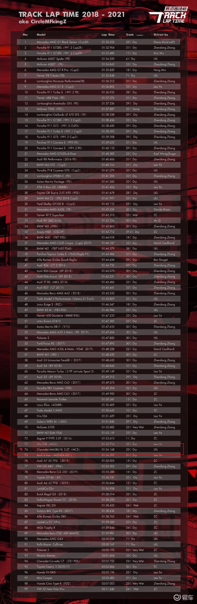 此次公布的榜单,为2018年至2021年参与刷圈的车辆,根据此次公布的99辆车型的成绩单来看,排名前十的,毫无意外都是些超跑,并且大多使用米其林Cup2R轮胎,且大多由现役CTCC职业车手驾驶。不过此次迈锐宝XL刷圈的成绩,依然力压众多大家眼里的大马力车型,例如奥迪A7 55 TFSi、阿尔法罗密欧Giulia 280。以及改装车爱好者眼里的大热门丰田GT86\斯巴鲁BRZ,以及小钢炮大众高尔夫GTi(MK7)、国产钢炮领克03+,由此可见迈锐宝XL确实有不容小觑的运动能力。