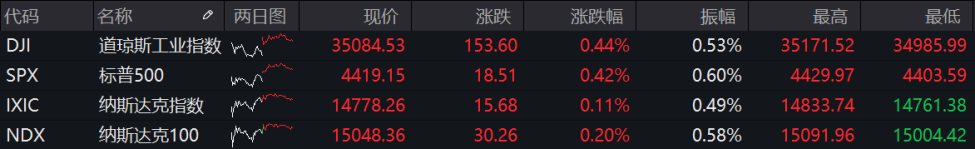 美股周四收高。美股在金融和材料板块带领下走高,连日下跌的标普和道指盘中齐创新高。其中,道琼斯工业平均指数小幅上涨153.6点,涨幅为0.44%,报35084.53点。纳指小幅上涨15.68点,涨幅为0.11%,报14778.26点。标准普尔500指数小幅上涨18.51点,涨幅为0.42%,报4419.15点。