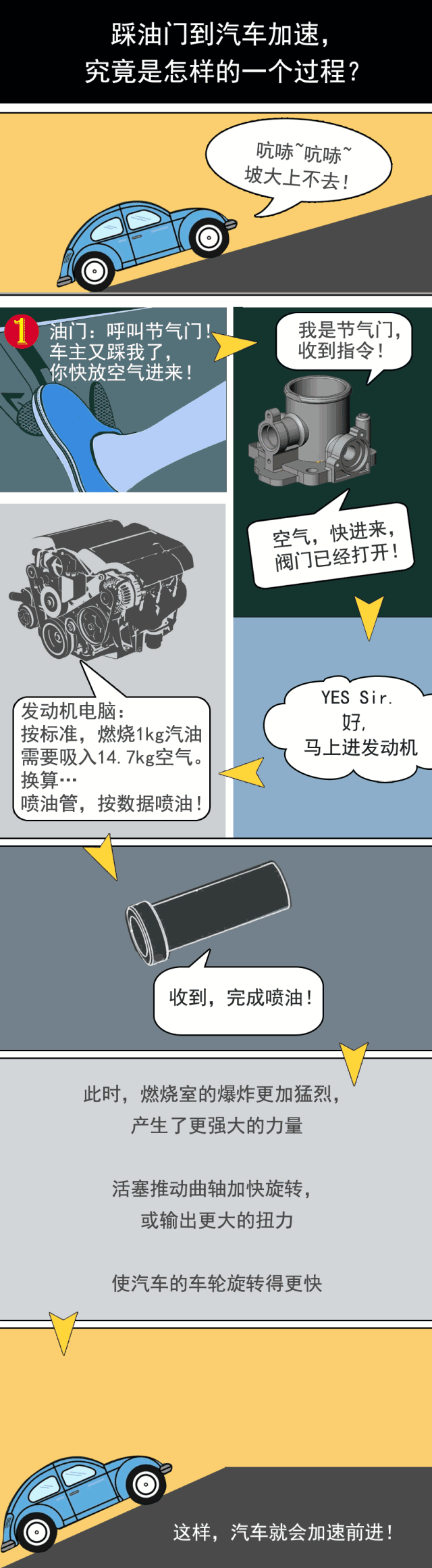 当你把加速踏板一踩,它就会把一个叫做“节气门”的阀门开得更大,让更多的空气进入到发动机里。