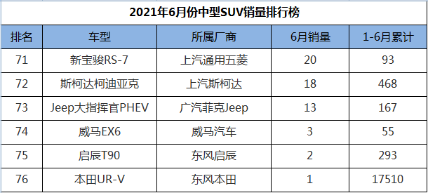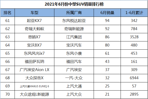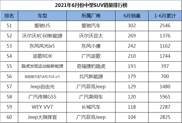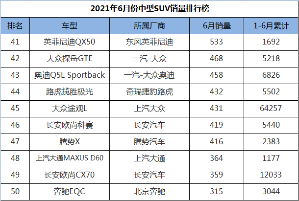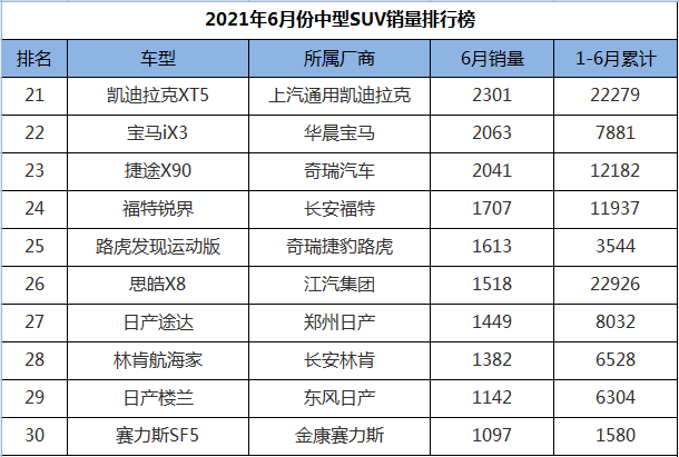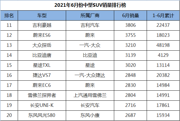 国产车当中,除了红旗HS5以外,奇瑞旗下的两款主力瑞虎8和捷途X70成绩也十分优异,本月奇瑞瑞虎8卖出11106辆排名第六,捷途X70卖出9285辆排在榜单第七位。二线豪华品牌车型中,沃尔沃XC60状态十分良好,单月拿下6710辆,而它的老对手凯迪拉克XT5只有2301辆进账。其余关注度较高的车型里,丰田汉兰达在6月份卖出6517辆,勉强搭上了前十名的末班车,而大众探岳和途观L却双双遭遇滑铁卢,其中探岳卖出3210辆排在第十三位,而途观L仅仅收获了431台,难道大众的好日子要到头吗?