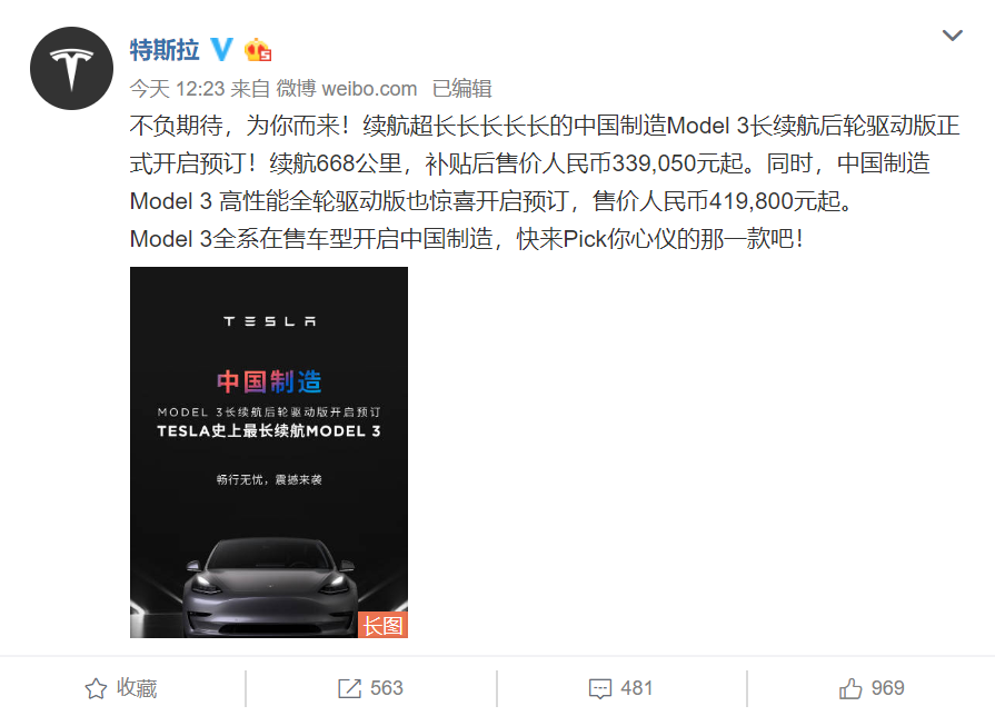 今天上午 11 点,特斯拉中国发布微博,表示国产 Model 3 标准续航升级版从即日起降价 1.5 万元,从 25.09 万元降价至 23.59 万元。