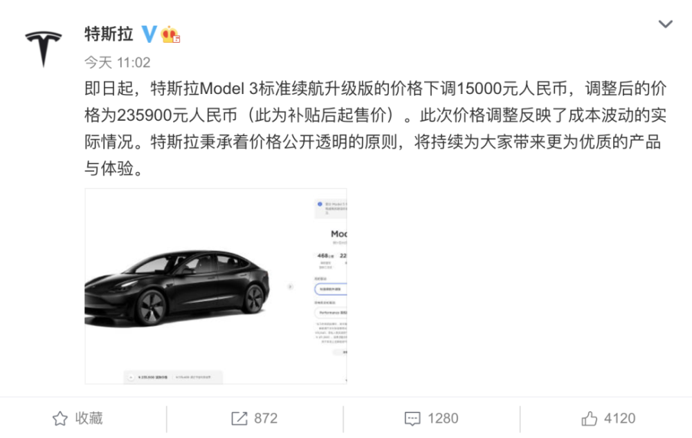 随着频繁调整价格,去年便传出国产特斯拉Model 3售价将下探至23万元区间的消息,但对此特斯拉方面回应称:“均为谣言。”面对本次谣言成真,有网友戏言:“辟谣不可信,期待Model 3降到20万元。”