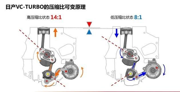 这台发动机的压缩比可在8:1(高性能)-14:1(高效能)之间实现智能切换,在低负载运行时,电机逆向推动连杆,简单点说,就是你在踩油门急加速时候就用低压缩比工作,低压缩比运行,释放发动机性能,而你在高速、城市续航,并不需要很猛踩油门时候,则采用高压缩比,这样带来更好的燃油经济性。
