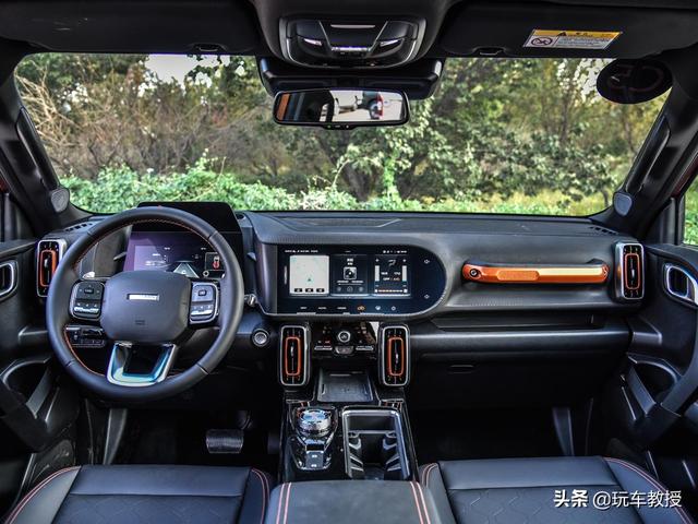 跟外观一样,内饰也充满了惊喜。同样以复古为主要基调,融合了不少科技型的配置,让车辆既有不错的怀旧味道,也能让驾驶员享受最新的科技,满足消费者贪心的心理。但是据实际体验,方向盘的角度稍稍上扬,当座椅调节得比较低时,有一种端着方向盘的感觉,这时候只需要将坐姿调整稍微适应即可,这也是哈弗大狗内饰的小短板。多功能其余使用圆角矩形的设计,不会过于死板,又与车内空调出风口设计元素呼应。