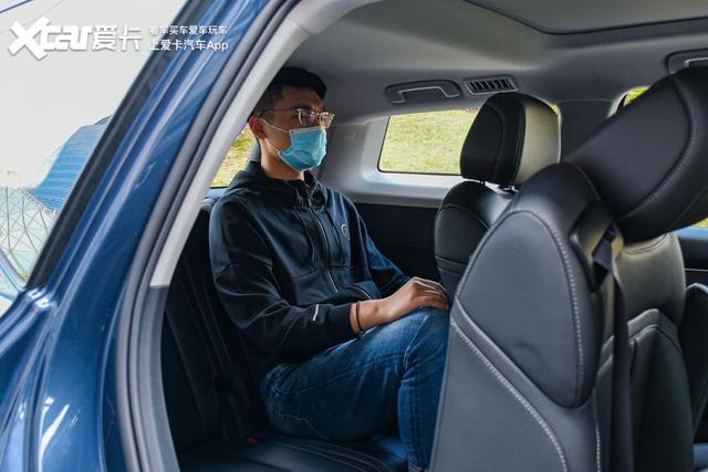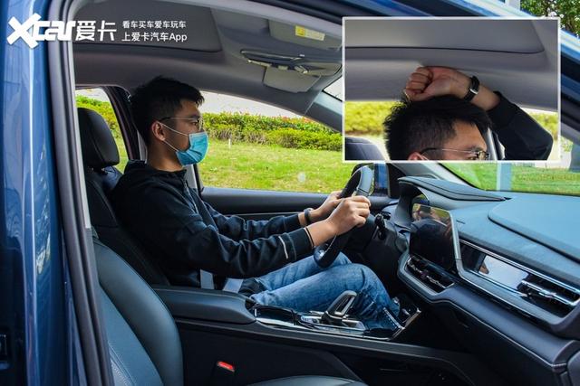 此时保持前排座椅不动,来到第二排,向前调节座椅至腿部顶到前排座椅,同时保持一个较小的靠背倾角。此时头发刚好接触车顶。