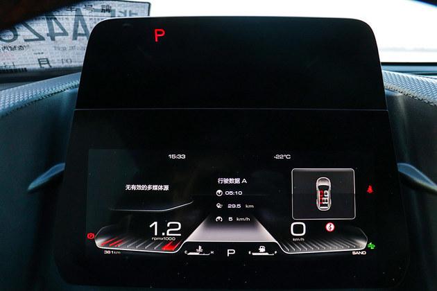 驾驶员前方配备的全液晶仪表盘造型别具一格,UI界面显示清晰,上方屏幕为挡位显示屏,同时也能起到仪表反光的作用。虽然屏幕多出来一截,但不会影响到前方视线和HUD抬头显示信息。