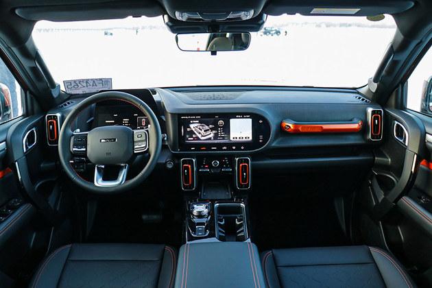 内饰方面,新车整体以黑色为主,再搭配银色镀铬饰条与色彩鲜明的橙色进行装饰,营造出潮流个性的车内氛围。此外,矩形出风口和副驾扶手等硬派元素也得以保留,这也是硬派越野车的常见风格。