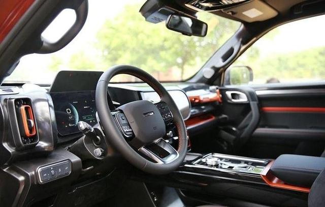 此外,回字形的空调出风口造型还挺别致的,横屏布局的大尺寸中控屏则形成了反差,呈现出一个U字形。副驾前方则附带一个把手以及分层的储物空间,而A柱还有辅助上下车的把手,这一般只有硬派越野车上才能看到。