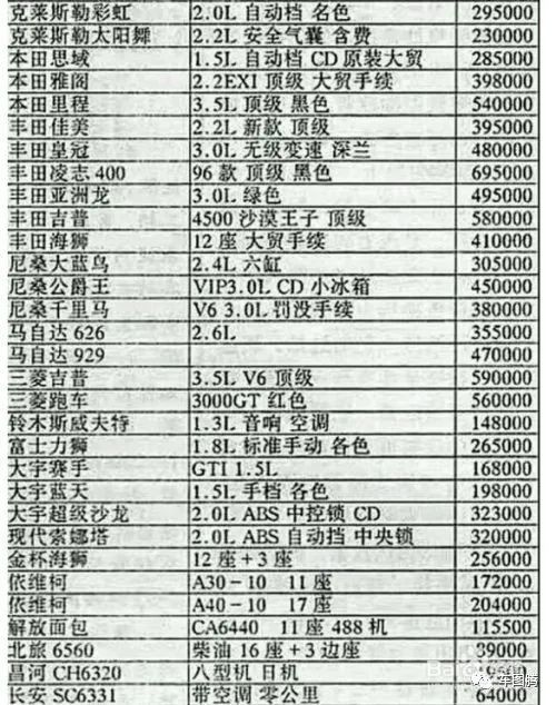 据车图腾获得的一份上世纪90年代的汽车报价单显示,当时一辆3.0L丰田皇冠的售价为48万元,顶配车型据说要到60万元左右。要知道,当时上海的房价每平米也才只有1000元左右!也就是说,一辆皇冠轿车,那时候可以换上海5套100平米的住房!