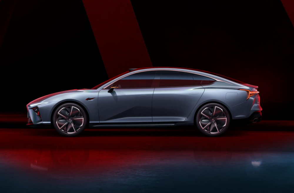 在车身侧面,新车则有着时下流行的大溜背轿跑式线条,流畅的车顶过度配合前后轮拱处犀利的腰线,车门下方独特的凹陷细节等元素,显得非常的动感。当然作为一款新能源车,大面积封死的气动轮毂,虚拟后视镜罩等元素也都没有缺席。