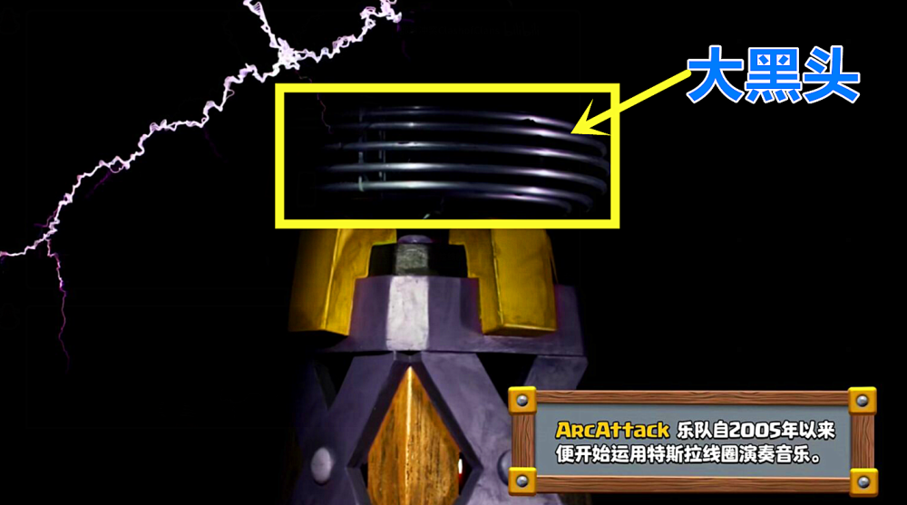 我们在看一看视频上的“特斯拉电磁塔”头上的线圈明显比“夜世界”的“超级特斯拉电磁塔”大上了不止一圈,除此之外线圈也变成了“黑色”这个操作绝对符合官方今年的思路,超级特斯拉电磁塔上面加“黑头”这个操作真的很“绝”