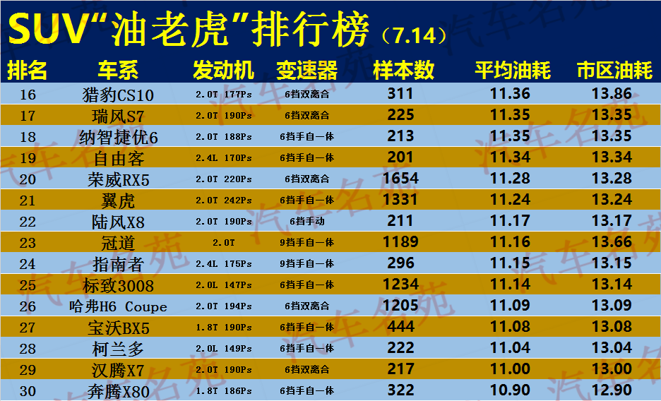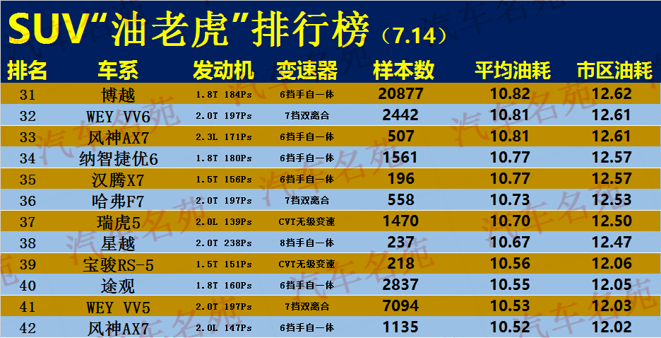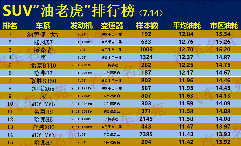 导读:现如今,买车对大多数家庭来说,已经是非常容易的事了,不过作为家庭第二大消费品,选车时也是万万不能马虎的。尤其是对那些新手来说,在面对“虚假信息满天飞,购车陷阱处处藏”时,如果不谨慎的话,一不小心就会被坑惨了。而在近日,国内市场调研机构就发布了上半年“最费油”汽车榜单,榜单罗列了42款车型,它们全部都是SUV车型,百公里油耗都超过了10.5个油。买车需谨慎!上半年“最费油”汽车榜单揭晓,大半都是国产车!