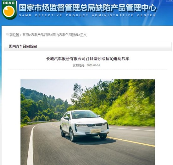 长城汽车股份有限公司决定自7月16日起,召回共计16216辆长城欧拉IQ电动汽车。召回原因为车辆搭载的部分动力电池的一致性与BMS软件控制策略存在匹配差异。长期连续频繁快充后,电池性能下降,极端情况下可能发生动力电池热失控,存在安全隐患。对此,公司将免费对召回范围内车辆的动力电池进行检测,并刷写适应工况场景的控制策略软件,必要时更换电池模组,以消除安全隐患。