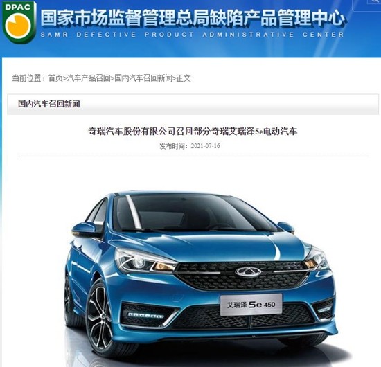 奇瑞汽车股份有限公司决定自7月16日起,召回共计1407辆奇瑞艾瑞泽5e电动汽车。召回原因为车辆动力电池内部分零件装配可能存在一致性波动。车辆经过长期使用,车辆底部受到异常撞击或经受剧烈颠簸冲击后,极端情况下可能导致电池包系统高压连接松动,局部接触内阻增高,大电流使用时造成组件过热并烘烤电芯,从而可能引起电池热失控,存在安全隐患。对此,公司将对召回范围内车辆的动力电池进行免费检查及维修,必要时给予免费更换模组或电池包,以消除安全隐患。