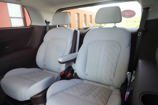 前后排座椅都配备了菱形格纹,打孔处理以及三排座椅带有扶手功能,看上去就很豪华。第二排座椅除了支持座椅加热/通风/按摩外,还带有电动腿托功能,无论家用还是商用,都是很具档次感的配置。