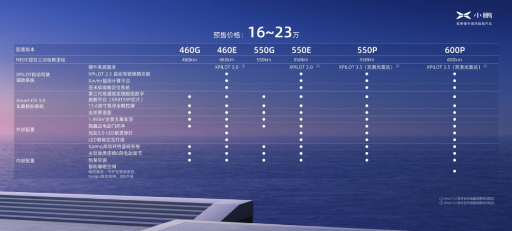 此次在粤港澳大湾区车展上公布预售价的小鹏P5,共推出了460G、460E、550G、550E、550P、600P等六款车型,新车预计在9月份正式上市。
