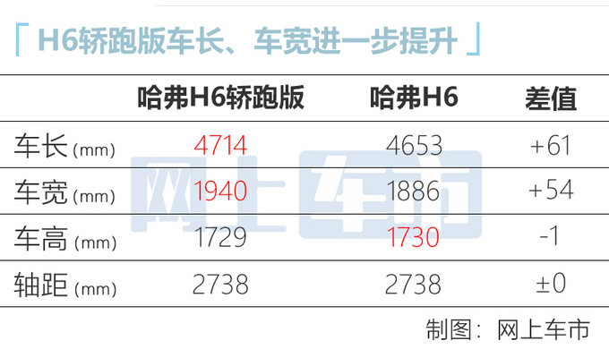哈弗H6轿跑版车身尺寸变化不大,仅高度提升8mm。动力方面,H6轿跑版搭载2.0T发动机,最大功率为155kW,峰值扭矩为325N·m,传动系统匹配7速双离合变速箱,百公里综合油耗为7.3L。