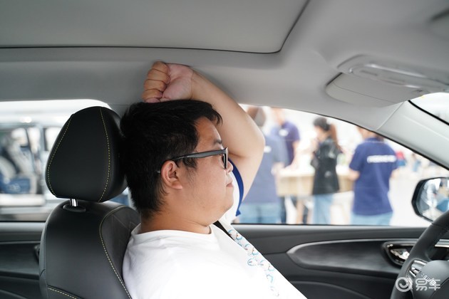 在保持前排座椅不变的情况下,同一体验者换乘至后排,头部的剩余空间为一拳三指,腿部空间剩余两拳。