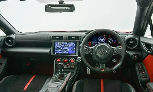 内饰方面,虽然整体布局变化不大,中控台也保留了大量的物理按键,但是GR 86无疑更加现代化,配备了覆盖面更大的液晶仪表,空调旋钮还带有液晶显示。同时还有包裹性更佳的运动座椅,采用皮+绒面进行包裹,并具备加热功能。而红色缝线、GR徽章为的就是彰显新车的运动气息和身份。