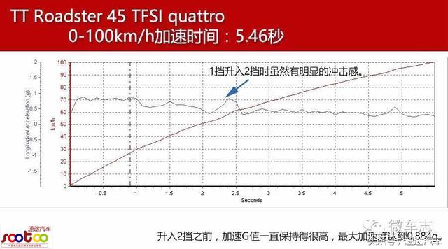 这样的四驱配合6速双离合变速器,在加速测试中会占有很多优势。TT有一套弹射模式应对日常的加速玩乐,并且激活模式简单。只有将驾驶模式调至“动态”,将ESC关闭,就能通过同时踩住刹车和油门踏板的方式弹射了,弹射模式下,起步最高转速可以达到4000rpm。即便是没有ESC的保护,TT Roadster 45 TFSI quattro在起跑瞬间轮胎也没有丝毫滑动,一点动力没浪费,稳健且快速。在升入2挡之前,加速G值一直保持得很高。1挡升入2挡时虽然有明显的冲击感,但用时非常短。最终,经过两次升挡TT Roadster 45 TFSI quattro用时5.46秒突破100km/h。