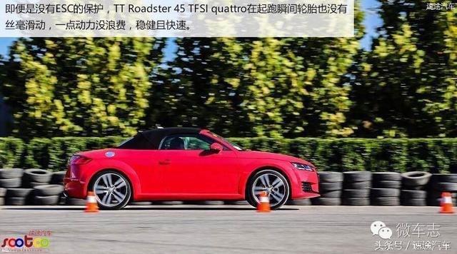基于跑车设计的TT将低重心与宽轮距的优势在绕桩测试中发挥得淋漓尽致。簧载重心与整车旋转中心的高度差非常小,力度较硬的弹簧支撑,TT在左右重心转移时表现得非常从容。但无论如何控制油门,它也总保持着趋于转向不足的架势。四驱对于向后轴分配动力还是略有保守。