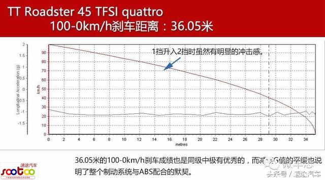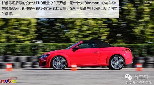 长前悬短后悬的设计让TT的重量分布更靠前,配合较大的Instant中心与车身中性线高度差,即便是有着较硬的前悬挂支撑,在刹车测试中TT还是出现了明显的前倾。但无论是几乎没有无效行程的刹车踏板,还是制动力的分布平均,都让TT有急刹时给人充分信心。事实上,36.05米的100-0km/h刹车成绩也是同级中极有优秀的,而减速G值的平缓也说明了整个制动系统与ABS配合的默契。