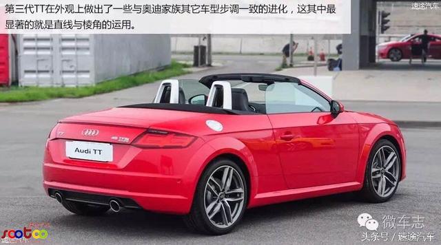 第三代TT在外观上做出了一些与奥迪家族其它车型步调一致的进化,这其中最显著的就是直线与棱角的运用。由圆润转为更立体化的造型让TT看上去更紧致了一些,事实上,新一代TT也确实比上一代缩小了尺寸。车身长度缩短了6mm,宽度缩小了10mm,高度降低了3mm,只有轴距加长了34mm。得益于全铝合金车身在轻量化方面的的进步,虽然第三代TT在配置及轴距上有所增加,但整备质量只比上一代车型重了120kg。