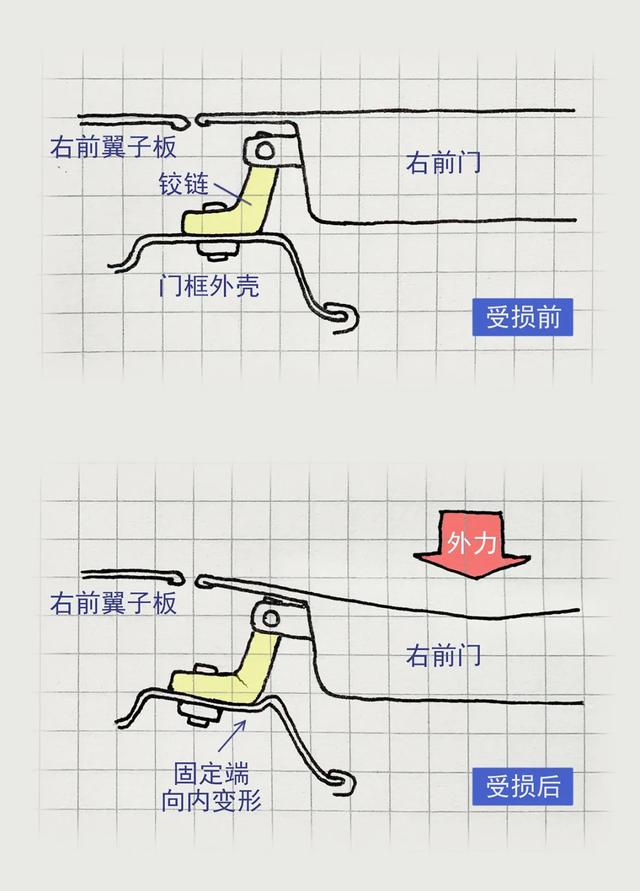 这是我花了大半个上午手绘的右前门铰链附近的截面图,看看大家看得懂不。黄色的是车门下铰链,当年那次右侧撞击,估计受力点比较靠近门轴,所以铰链的固定端出现了往里的凹陷。后来更换了车门,并对车身的铰链处做了修理,把凹下去的地方又拉了出来,这要是不跟我说,完全察觉不到哈。